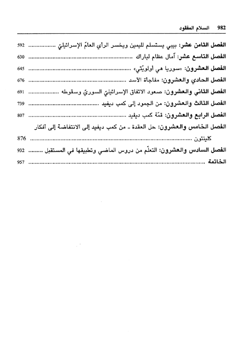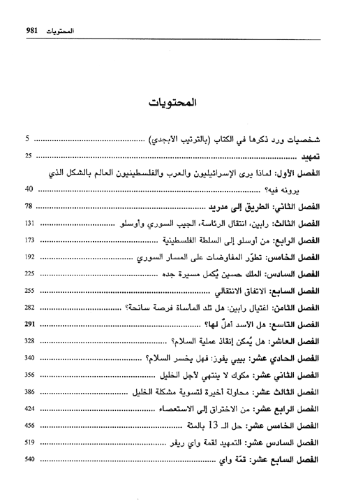 في هذه الصفحات يروي لنا دنيس روس عملية السلام بدءاً من العام 1988، عندما التحق بوزارة الخارجية الأميركية تحت إدارة جايمس بيكر، وحتى انهيار المفاوضات في أواخر عهد كلينتون الأمر الذي دفع الفلسطينيين إلى إطلاق "انتفاضتهم الثانية" والإسرائيليين إلى شن هجومهم العسكري الواسع في الضفة الغربية وقطاع الغربية وقطاع غزة. وطوال هذه المسيرة، يروي روس بإثارة شديدة جميع النواحي الحاسمة في البحث عن السلام: اجتماعات القمة في مدريد وأوسلو وجنيف وكمب ديفيد: اغتيال إسحاق رابين، وصول بنيامين نتنياهو إلى السلطة وخروجه منها، الشخصيات والاستراتيجيات المستقلة والمتميزة لكل من رابين وشمعون بيريز وياسر عرفات وحافظ الأسد وبيل كلينتون، والخطوات الأولى المتعثرة للسلطة الفلسطينية. ثم ينقلنا إلى ما وراء الكواليس للتعرف على الدبلوماسية التي كان يراهن عليها الجميع ويروي لنا أخبار اجتماعات القمة والمفاوضات السرية التي كانت تجري على مدار الساعة، إضافة إلى الاحباطات والنكوس بالوعود.