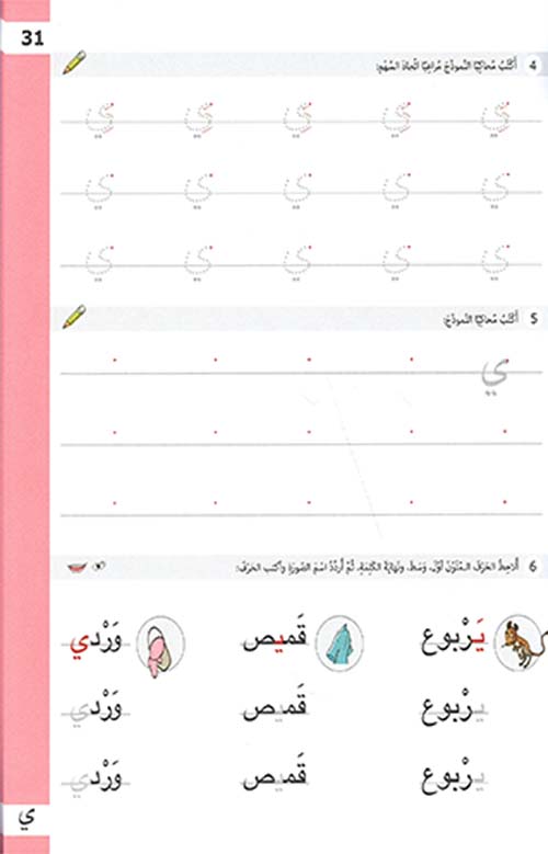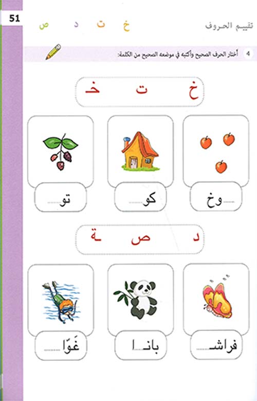 - كتاب يهدف إلى تعليم الحروف والمفردات والأصوات والكتابة، الكتاب يشتمل على 28 حرفا، 200 صورة، 200 كلمة.