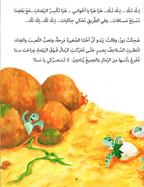 خرجت السلحفاة الصغيرة من البيضة وأخذت تبحث عن الطريق إلى البحر... شاهدت ...طائر العقاب يحوم في الجو فخافت أن يهاجمها هي وأخواتها الصغار.... مع السلاحف نعيش رحلة خطيرة وممتعة ونتعرف على معلومات وأسئلة تبحث عن إجابات، في القصة أفكار لأبحاث وهوايات وأوقات ممتعة ورحلات.