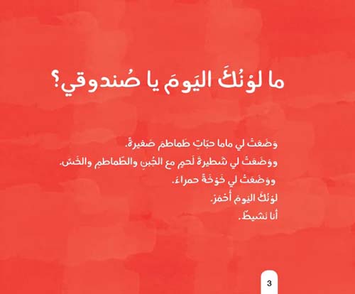 نبذة الناشر:قصة خفيفة الظل، يعبر فيها طفل عن مشاعره عند رؤية مكونات صندوق طعامه، إيحاءات الألوان تحفز المشاعر الإيجابية لدى الطفل نحو الطعام الصحي المفيد