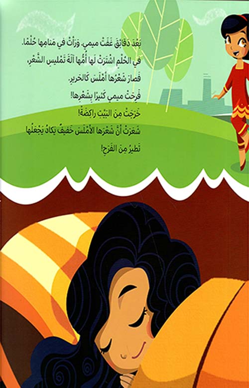 نبذة الناشر:شعر ميمي أسود وطويل و... ملوى! وهي تريد، أكثر من أي شيء، أن يصبح شعرها أملس مثل شعر الأميرات. لكنّ أمها ترفض أن تشتري لها آلة لتمليس الشعر لأنها مازالت صغيرة. تنام ميمي وترى حلماً. ماهو هذا الحلم الذي جعل ميمي تغير رأيها بخصوص شعرها الملوّى؟