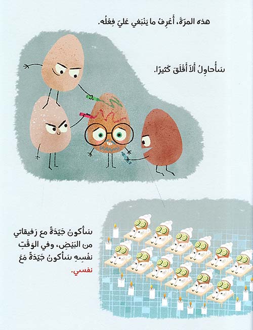 نبذة الناشر:"سأحاول ألا أقلق كثيرًا، سأكون جيدة مع رفيقاتي من البيض، وفي الوقت نفسه سأكون جيدة مع نفسي...... البيضات الأخريات لسن كاملات، وليس علي أن أكون كاملة أنا أيضًا."