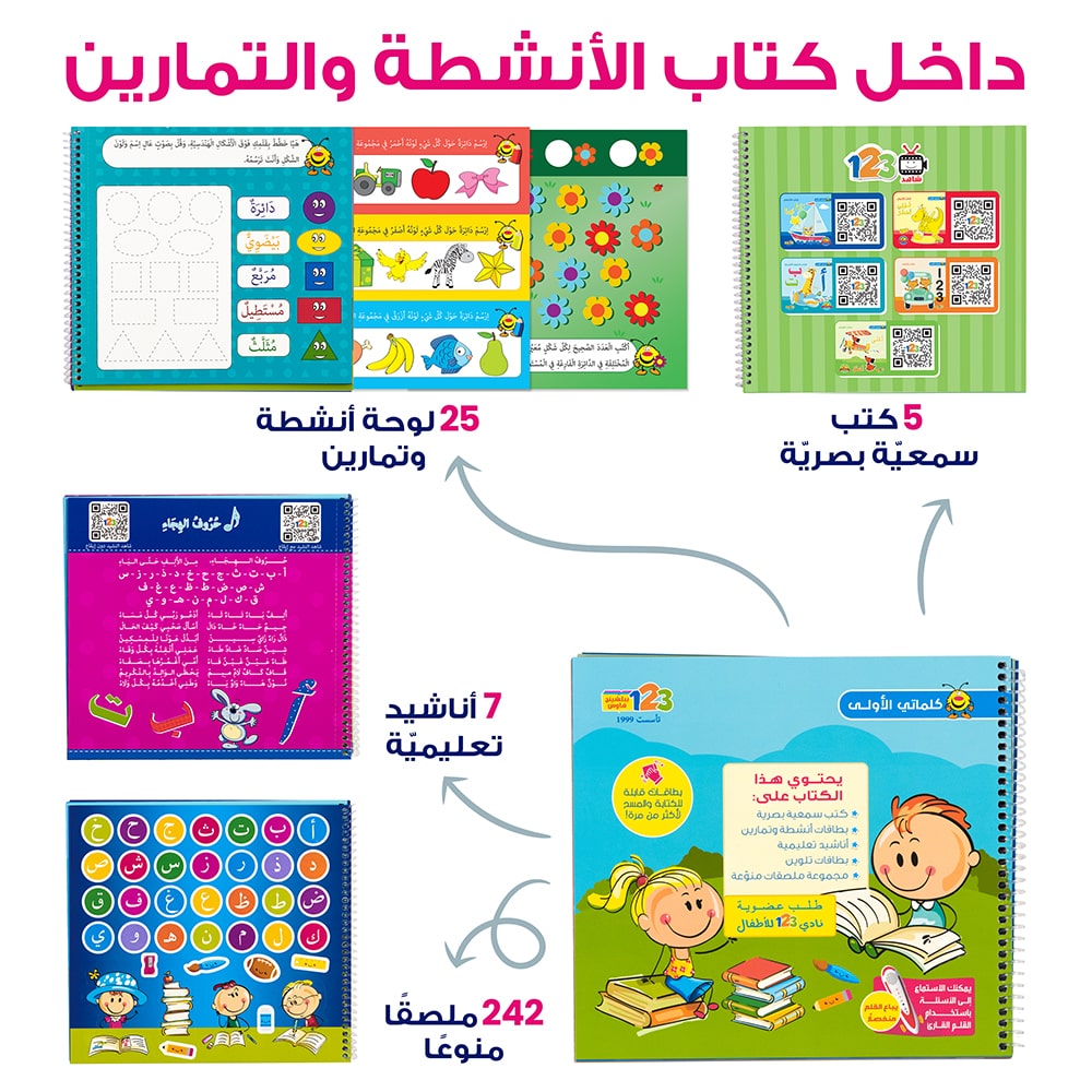 نبذة الناشر:مرفق مع الكتاب قلم حبر مائي مع مساحة. صفحات مخرّمة وقابلة للنزع وللكتابة والمسح لأكثر من مرة. يحتوي الكتاب على:5 قصصQR سمعية أو سمعية بصرية، 25 لوحة أنشطة وتمارين، 242 ملصقًا منوعًا، 7 أناشيدQR للاستماع أو المشاهدة مع إيقاع أو دون إيقاع و طلب عضوية للانضمام إلى نادي 123 للأطفال. ...إقرأ المزيد