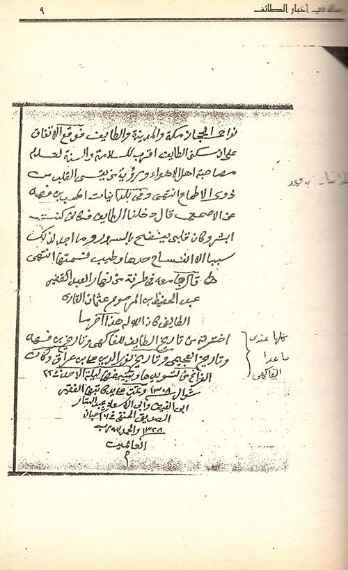 نبذة الناشر:مؤلف الكتاب الذى نقدم له اليوم فهو: الشيخ عبد الحفيظ بن الشيخ عثمان القارى، من علماء الطائف المتأخرين، ولد بالطائف وأخذ العلم عن علمائها، ومنهم: والده الشيخ عثمان الذى كان يملك مكتبة ضخمة، ثم رحل إلى الأستانة وأخذ عن فضلائها، وأدى اختبار العالمية أمام لجنه من العلماء والمحققين، ربع بعدها ...لنشر العلم فى بلاده، وكتابه هذا يعد رسالة مختصرة من أربعة تواريخ، لم يزد فيها على ما فى كتب سابقيه إلا بقوله عند ذكر ما كان فى الطائف من المآثر والمزارت: "وقد اندرس أكثر المآثر التى ذكرهاالمؤرخون" كتب هذه الرسالة سنة 1308هـ، وهى فى ثمان ورقات، وكان الفراغ من تسويدها وتبيضها ليلة الأحد 22 شوال 1308هـ، وتمت على يد كاتبها الفقير أبى الفيض وأبى الإسعاد عبد الستار الصديقى الحنفى فى 16 شعبان 1328هـ، وهى النسخة التى اعتمدتها فى التحقيق، وهى مصورة عن مكتبة الحرم المكى.
