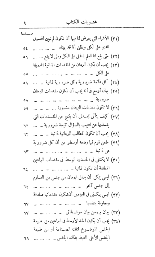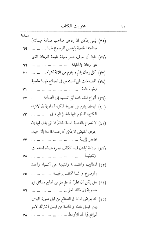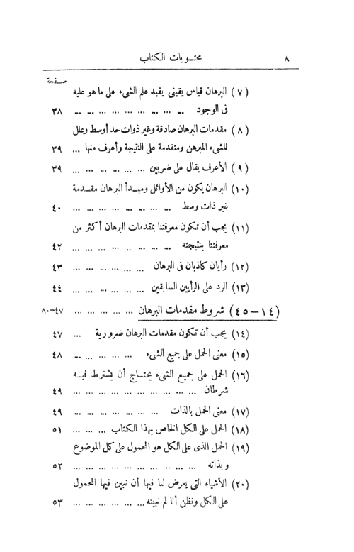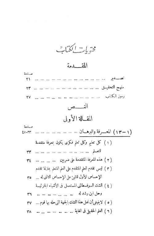 أما المقالة الثانية: (106-124) الحد ونسبته إلى البرهان، (125-133) الأسباب والعلل والبراهين، (134-156) التحديد وطريق القسمة والحصول على مبادئ البرهان، (157) انتهاء المقالة الثانية والكتاب. إقرأ المزيد