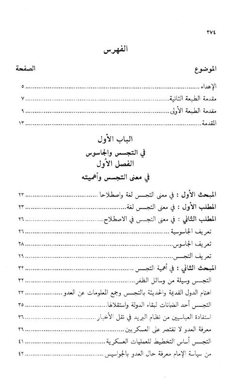 وفي هذا الكتاب المدوّن بقلم "محمد راكان الدغمي" دراسة نظرية تحليلية مقدمة من المؤلف لنيل درجة الماجستير في السياسية التشريعية. وهي معنونة بـ: التجسس وأحكامه في الشريعة الإسلامية ومنها يلملم الباحث شتات ما تفرق في بطون الكتب القرآنية الإسلامية من قواعد تعالج موضوع التجسس، مبيناً مما جمعه ماهية التجسس وتعريفه كما يستقرأ من هذه المبادئ تاريخه وأساليبه، وهدفه من كل ذلك توضيح حكم الشريعة الإسلامية فيه، ما يحل منه وما يحرم، وجمع الأحكام الشرعية المتعلقة به. وكان للمؤلف إلى جانب جمع المادة والإتيان بالمعلومات الفريدة والنادرة في متفرق الكتب وبطون الرسائل، حسن العرض والاعتماد على الأدلة ومناقشة الموضوعات، وبيان الرأي الخاص شأن الباحث المتمكن البصير، في أسلوب رصين، وعرض متفنن. إقرأ المزيد