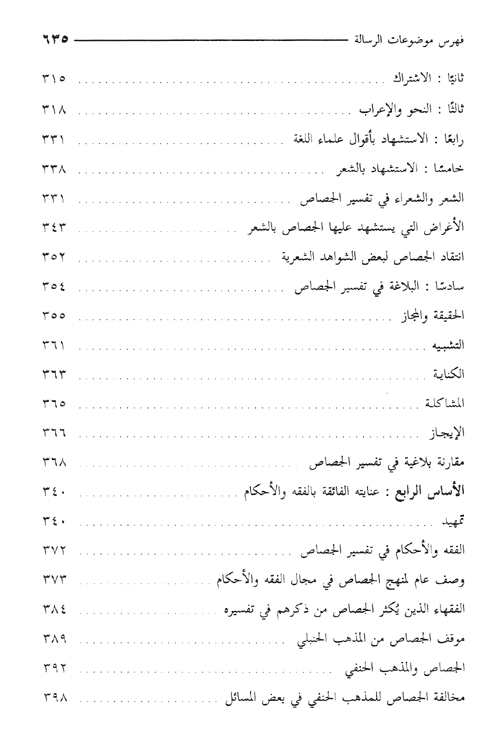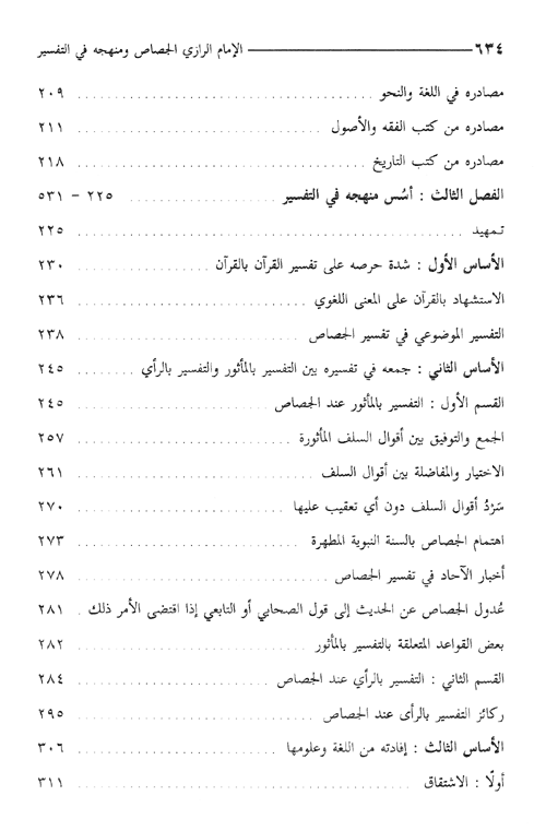 فبعد تعريفه بهذا التفسير، وبيان المصادر التي استقى منها الإمام الجصاص مادته العلمية، والتي شملت العديد من مصادر التفسير، والحديث، واللغة، و النحو، والفقه، والأصول، والتاريخ وغير ذلك، فصل القول في الأسس التي بنى عليها الجصاص تفسيره، وبعد دراسة واستقراء تفسير "أحكام القرآن" كاملاً تبين له أن هذا المنهج قام على أسس تتمثل في: حرص الجصاص على تقديم تفسير القرآن بالقرآن، وجمعه بين التفسير بالمأثور والتفسير بالرأي، وإفادته من اللغة وعلومها، وعناية فائقة بالفقه والأحكام.