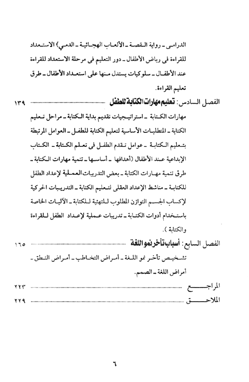 أما الفصل الخامس فقد خصصاه لتعليم القراءة والكتابة لطفل ما قبل المدرسة، وتوصلاً إلى أن المناقشات التي تحدث بين الطفل والمعلم داخل الروضة تساعد الطفل على استخدام كلمات ومفردات كثيرة من خلال مشاركته في الحديث مع الأطفال الآخرين. وفي الفصل السادس يضعان الشروط الملائمة لتهيئة الطفل وإعداده للكتاب حيث تعتمد الكتابة على التآزر البصري الحركي فتناسق حركات العين مع اليد يحتاج إلى تدريبات كثيرة. ويفردان الفصل السابع والأخير للبحث في أسباب تأخر نمو اللغة وهو عدم مقدرة الطفل على التجريد اللغوية واستعمال الجهاز الرمزي للغة وأسبابه كثيرة أهمها الحرمات الحسي، السمع، الحواس الأخرى، الاضطرابات العصبية، والتخلف العقلي. إقرأ المزيد
