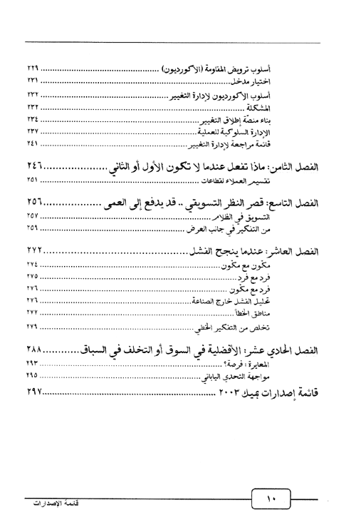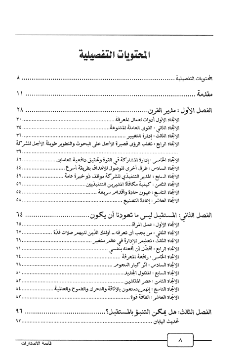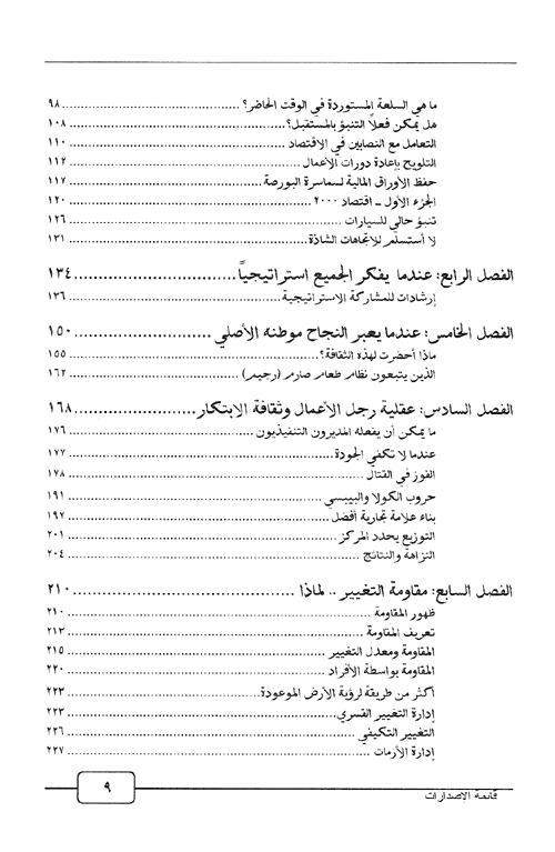 نبذة الناشر:من أجل الساعين لمعرفة أفضل الأقوال والأفعال والممارسات الإدارية والإنسانية للمشاهير من القيادات الإدارية ورؤساء الشركات العملاقة. في علم الإدارة علينا أن نتعلم من أصحاب قصص النجاح الذين كان عليهم أن يوجهوا المشكلات والعوائق بأساليب وحلول غير تقليدية مكنتهم من تقديم المثل والنموذج في التعامل مع المواقف الصعبة بقراءتك لهذا ...الكتاب ستدرك أن المستقبل الذي سنواجه مختلف تماماً عما تعودنا عليه وكذلك الحال بالنسبة للمشكلات المتوقع أن نواجهها لذا علينا جميعاً أن نفكر اليوم في أدوات المستقبل. ويحتوي الكتاب على: القائد والمستقبل، مدير القرن، المستقبل ليس ما تعودنا أن يكون، هل يمكن التنبؤ بالمستقبل. التفكير والمستقبل، عندما يفكر الجميع استراتيجياً،عندما يغير النجاح موطنه الأصلي، عقلية رجل الأعمال وثقافة الابتكار، مقاومة التغيير لماذا. التسويق والمستقبل، ماذا تفعل عندما لا تكون الأول أو الثاني، قصر النظر التسويقي قد يدفع إلى العمى, عندما ينجح الفشل, الأفضلية في السوق أو التخلف في السباق. إقرأ المزيد