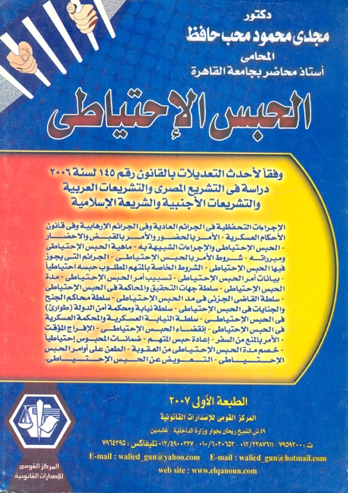 نبذة نيل وفرات:يتناول الكتاب دراسة موضوع الحبس الإحتياطى بادئاً بشرح بعض الإجراءات السابقة له مثل الأمر بالحضور و أمر القبض والإحضار ومشتملاته ومدة القبض وبعض إلحالات مثل حالة القبض على المتهم خارج دائرة المحقق وتعليمات النيابة العامة بخصوص هذا الشأن. بعدها يقوم المؤلف يتناول بعض العموميات حول الحبس الاحتياطى وماهيته ثم ...يقدم لنا نبذة تاريخية عنه فى مصر الفرعونية والعصر الرومانى وأخيراً فى الشريعة الإسلامية ثم فى عودة إلى القانون الحضار يقوم بتعرض الحبس الإحتياطى ومبرراته والتكييف القانونى له. نجد ايضا ذكر للجرائم التى يجوز فيها وشروطة الشكلية وسلطته والإفراج المؤقت وكل ما يتعلق بهذا الشأن وفقاً لأحدث التعديلات القانونية. إقرأ المزيد