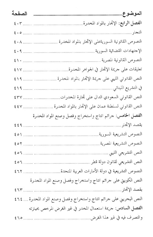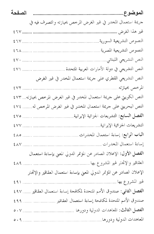 وبعد هذا الباب الواسع، تحول المؤلف في الباب الثالث إلى الجانب القانوني للمشكلة، فاستعرض مواقف قوانين المخدرات العربية من استيراد المواد المخدرات وتصديرها ونقلها وتهريبها وصنعها وزراعتها والاتجار بها وحيازتها وتعاطيها، فشرح هذه المواقف، وقارن بينها، في ضوء الاتجاهات الحديثة التي اختارت أفضل السبل لمكافحة الاتصال غير المشروع بالمواد المخدرة والمؤثرات العقلية.