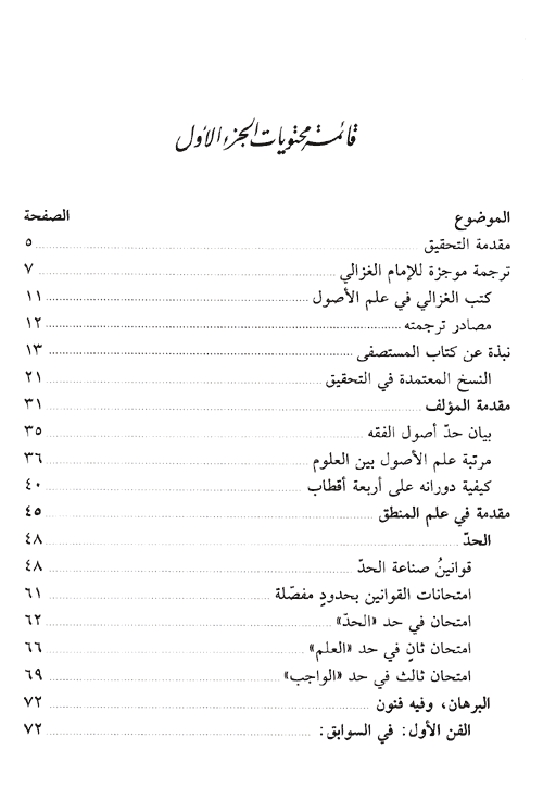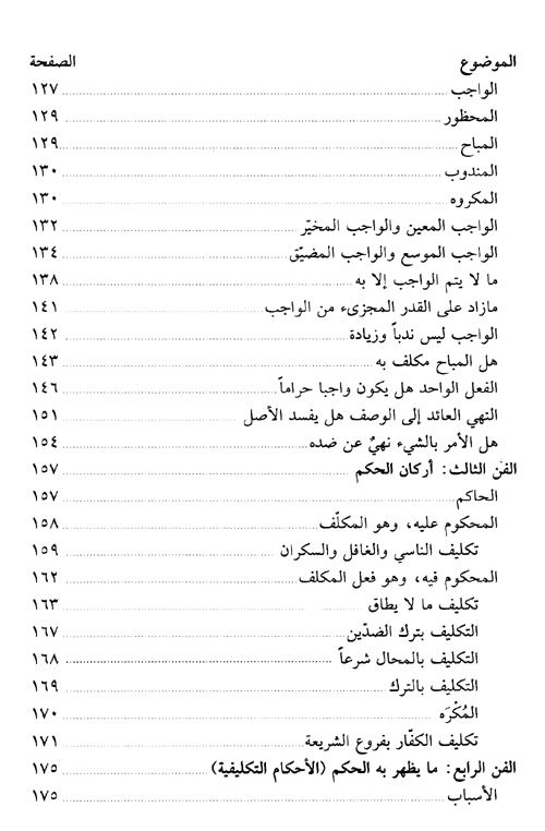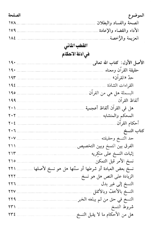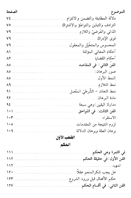 جاء الكتاب في جزئين: تضمن (الجزء الأول) مقدمة التحقيق ومقدمة المؤلف ومقدمة في علم المنطق وتضم الحدّ، البرهان، يلي ذلك القطب الأول (الحكم) ويضم: حقيقة الحكم، أقسام الحكم، أركان الحكم، الأحكام التكليفية، ثم القطب الثاني (في أدلة الأحكام) ويضم: الأصل الأول: كتاب الله تعالى، الأصل الثاني: سنة رسول الله (ص)، الأصل الثالث: الإجماع، الأصل الرابع: دليل العقل والإستصحاب، وأخيراً الأصول الموهومة وهي أربعة: 1- شرع من قبلنا، 2- قول الصحابي، 3- الإستحسان 4- الإستصلاح.