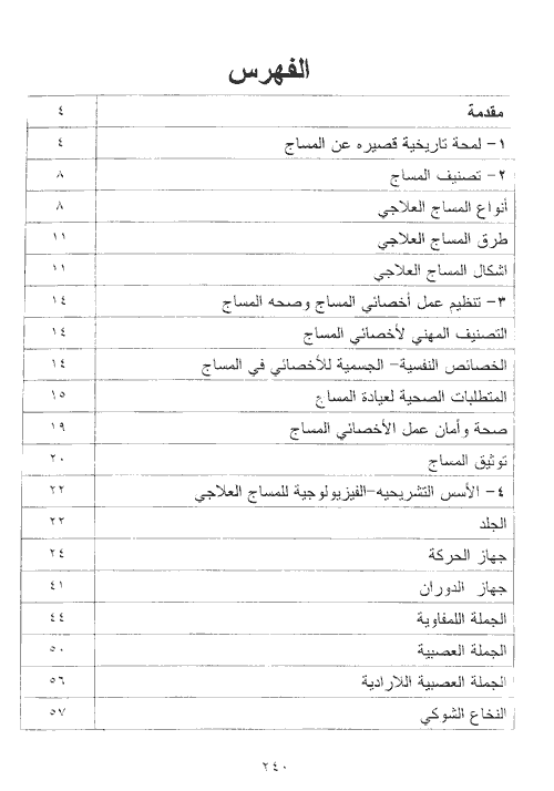 وبعدها ينقلنا الكتاب إلى فكرة موسعة وواضحة عن الأسس التشريحية الفيزيولوجية للمساج العلاجي في القسم الخامس والسادس يبحث الكتاب في المساج التقليدي وكيفية تنفيذه والتقنيات اللازمة في ذلك.