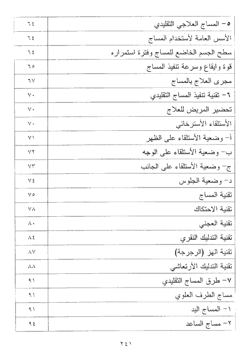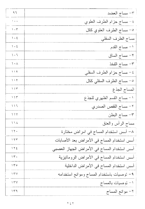 وبعدها نلاحظ الشرح المفصل لطرق المساج لكل أجزاء الجسم ومنه ننتقل إلى أسس وقواعد استخدام المساج في الأمراض العصبية والروماتيزم والداخلية وبعد الأصابات. قبل أن يوصلنا الكتاب إلى نهاية التي تتضمن فكرة موسعة وشرح عن المساج في الوسط المائي والمساج بالاجهزة والمساج الصيني يوقفنا عند محطة يصف فيها ويستعرض كل أنواع المساج العلاجي بالتفصيل. هذا الموضوع مشبع بمجموعة غنية من الرسومات والصور التوضيحية وذلك لمساعدة القارئ في قراءة موضوعاته برغبة وبشكل اسهل وأمتع وأكثر دقه.