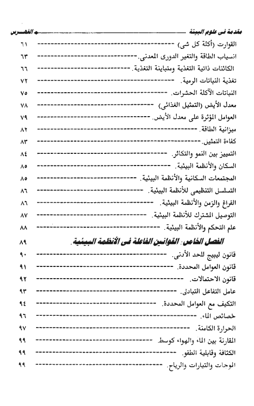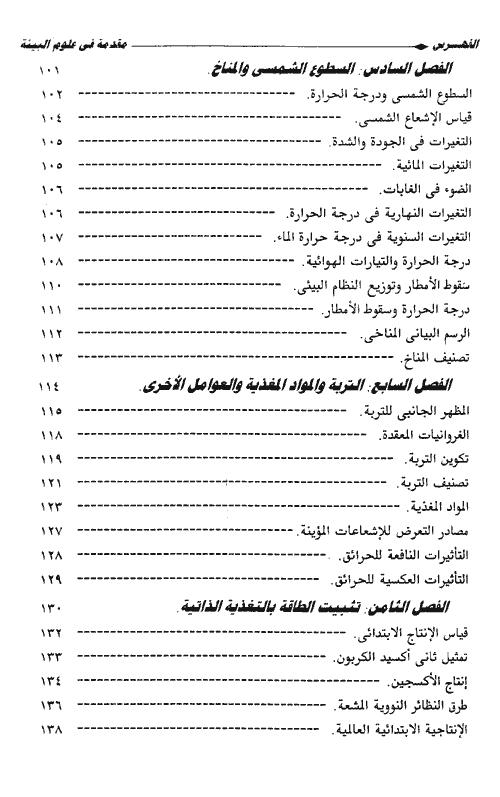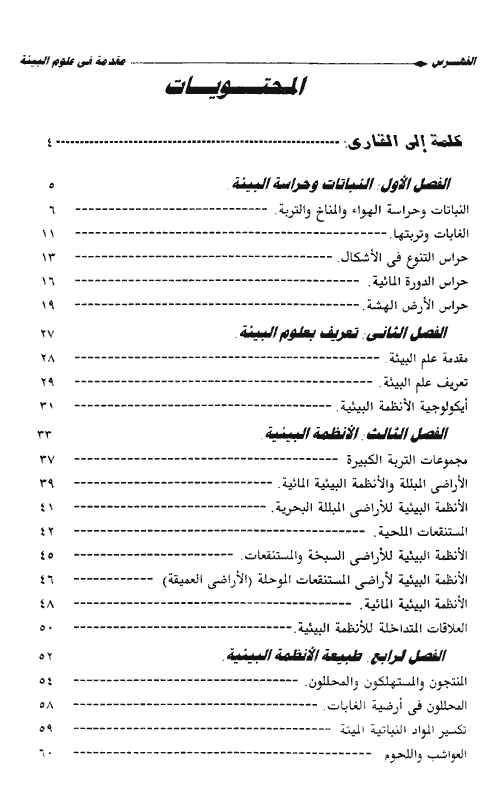 نبذة الناشر:تعتبر الدراسات عن البيئة في وقتنا الحاضر من الجوانب الهامة في حياتنا وذلك لفهم العديد من الظواهر التي تحيط بنا فضلاً عن الانعكاسات التي تسببها المدينة من تلوث في الهواء والمياه والزرع.. وهذا الكتاب يتعرض للمبادئ الأساسية الهامة لعلوم البيئة بطريقة جيدة وواقعية تتوافق مع أهمية هذا العلم في زماننا ...الحاضر.. ويتعرض الكتاب لدراسة الأنظمة البيئية ودور النباتات في دراسة البيئة والمعارف البيولوجية بجانب دراسة منفصلة للبيئة الصحراوية وهي أكثر ما تتميز به بلادنا العربية.