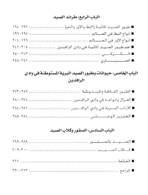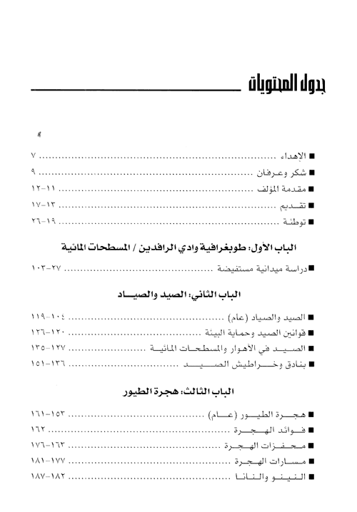 وقد بحث المؤلف موضوع الصيد في جزئين، الثاني سيصدر قريباً وفيه سيتناول الصيد المائي بنوعيه النهري والبحري. أما الجزء الأول، وهو بين يدي القارئ، ففيه يتناول المؤلف الصيد البري وبأسلوب فيه الكثير من السلاسة والدقة والتركيز على أهم العناصر التي يسعى لها الصياد (الطيور المهاجرة)؛ هجراتها، أساليبها، أنواعها، العوامل البيئية الطبيعية، والتي كانت لغزاً يحير نفس كل صياد. بالإضافة إلى ذلك وضع المؤلف في كتابه مقترحات للأسس والأنظمة والقوانين لممارسة هواية الصيد التي استمرت منذ القدم دون ضوابط ولا أنظمة حتى تهددت أنواع كثيرة من الطيور بالانقراض نتيجة المجازر التي يرتكبها بعض الصيادين (المحترفين الجشعين) من وضع السموم في الأهوار إلى استعمال الشباك.