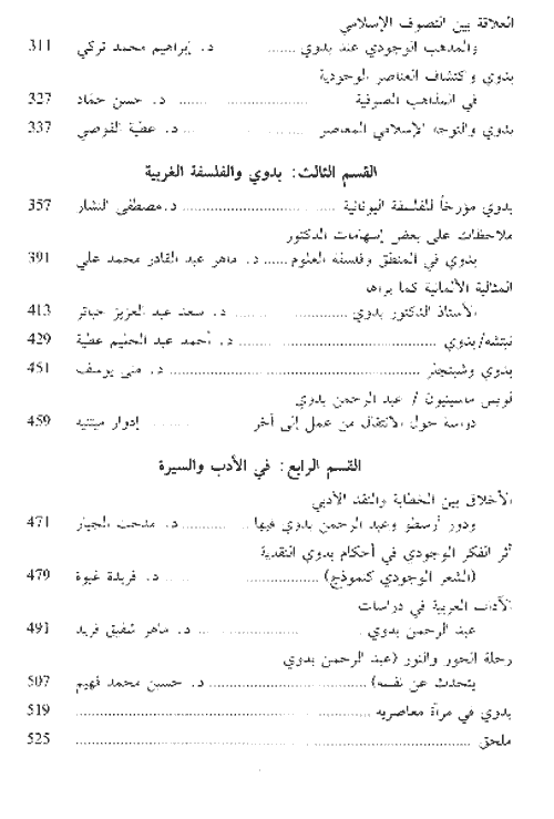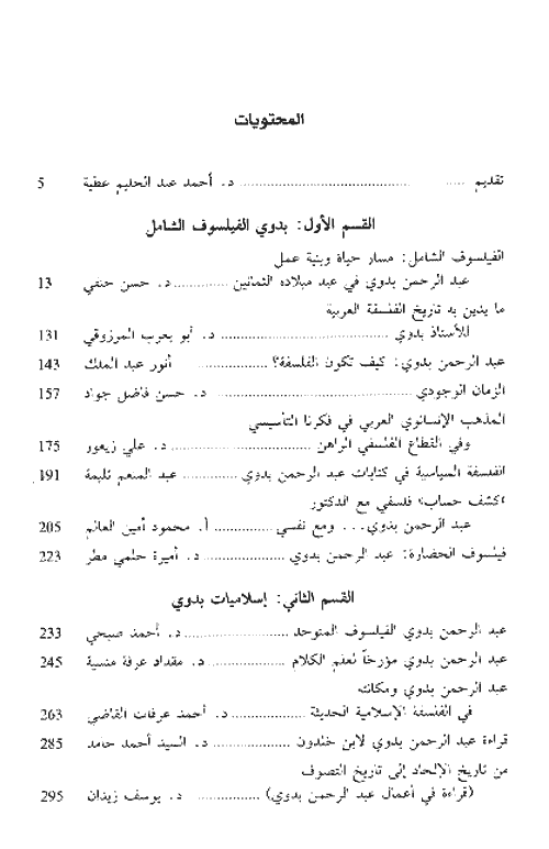 وهي مقسمة إلى أربعة أقسام: الأول من "مبتكرات بدوي"، وهو يشمل دراسات تتناول أعمال الفيلسوف في إطارها النظري العام، ويضم ثمان دراسات: افتتحت بدراسة الدكتور حسن حنفي عن "الفيلسوف الشامل، مسار حياة وبنية عمل، عبد الرحمن في عيد ميلاده الثمانين". ويتناول حنفي بدراسته المطولة، التي تكون بمفردها كتاباً عن بدوي، والتي تم جعلها افتتاحية لهذا الكتاب، أعمال الفيلسوف بالحوار، حيث يناقش، في فقرات سبع، جهود بدوي والأطر الكلية للكتابات من خلال مفهوم الحوار أولاً: من جيل إلى جيل، ثانياً: الفلسفة على الاتساع، ثالثاً: الجبهات الثلاث، رابعاً: المشروع الفلسفي العلمي، خامساً: المشروع الفلسفي النهضوي (الأنا)، سادساً: المشروع الفلسفي التاريخي (الآخر)، سابعاً: المشروع الفلسفي الإبداعي (الواقع).