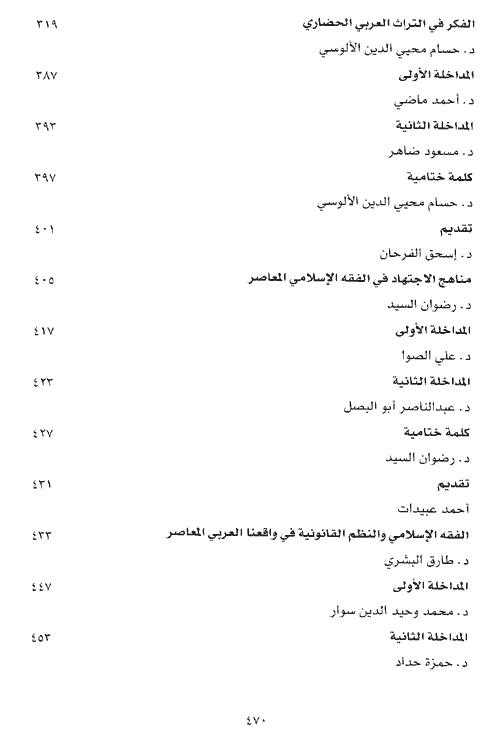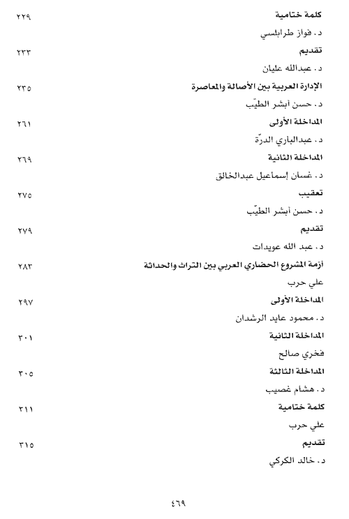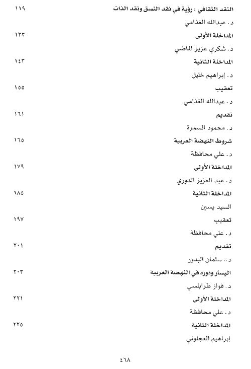 تتوجه هذه (الحوارات) إلى عناوين عشرة، تتقارب حيناً وتتباعد حيناً آخر، بيد أنها في جملتها ترتد إلى القضايا والمسائل المركزية التالية: المسألة الأولى: الثقافة وعلاقاتها بالمجتمع وبالسلطة السياسية. المسألة الثانية: التراث والحداثة. المسألة الثالثة: النهضة وشروطها. المسألة الرابعة: الشريعة الإسلامية: مناهجها وعلاقتها بالنظم والقوانين الوضعية. وتعكس (النصوص) الأساسية التي تعالج هذه القضايا مرجعيات متعددة متباينة. إذ يتردد أصحابها بين ثلة من "التيارات" المنهجية والمذهبية التي تمتد على محور (الاتباع-الابتداع). فيتعلق بعضهم بأصول تاريخية وتراثية صارمة، ويتوجه آخرون إلى أقصى المناهج أو المذاهب المستحدثة، بينما عرض فريق ثالث على "التوسط" بين الأطراف والنأي عن الغلو في هذا الاتجاه أو ذاك.نبذة الناشر:يمثل هذا الكتاب الإصدار الرابع من سلسلة "حوارات في الفكر العربيّ المعاصر"، التي استضافها منتدى عبد الحميد شومان الثقافي خلال العام 2001، بمشاركة نخبة من أبرز المفكرين والمبدعين العرب ممن أغنوا الحياة العربية المعاصرة بمشروعاتهم الثقافية والنهضوية والأدبية والاجتماعية.