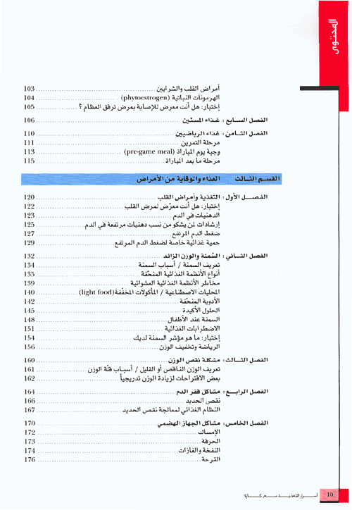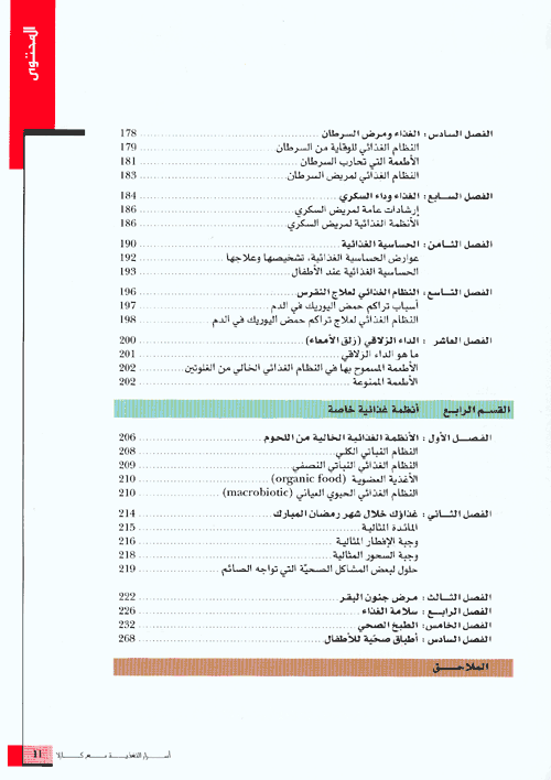 هذا وقد قسمت مواضيع كتابها إلى فصول عدة تحدثت من خلالها عن القسم الأول تعريف الغذاء وأهمية والمواد التي تكوّن الغذاء، القسم الثاني خصصته للحديث عن مراحل الغذاء عند كل من المرأة الحامل، والمرضعة، وغذاء الرضيع وغذاء المراهقين وغذاء المرأة خلال فترة انقطاع الطمث، وغذاء المسنين والرياضيين، أما القسم الثالث فقد تناولت فيه الغذاء والوقاية من الأمراض مرض القلب، مرض السمنة، مشكلة نقص الوزن، مشاكل فقر الدم، مرض السرطان، غذاء وداء السكري، القسم الرابع عالج أنظمة غذائية خاصة، وقد أرفق الكتاب بجداول توضيحية وصور واختيارات وإرشادات عامة، ووصفان لأطباق شهية، ولائحة بالمواد الكيميائية في الأطعمة.نبذة الناشر:اشتهر علم الغذاء والتغذية من خلال البرنامج الناجح الذي تقدّمه السيدة كارلا حبيب مراد على تلفزيون المستقبل ضمن فقرة عالم الصباح، وهي الرائدة في مجال الإعلام عن قضايا التغذية وعلوم الغذاء، وتطل على المشاهدين يومياً منذ أكثر من خمس سنوات.