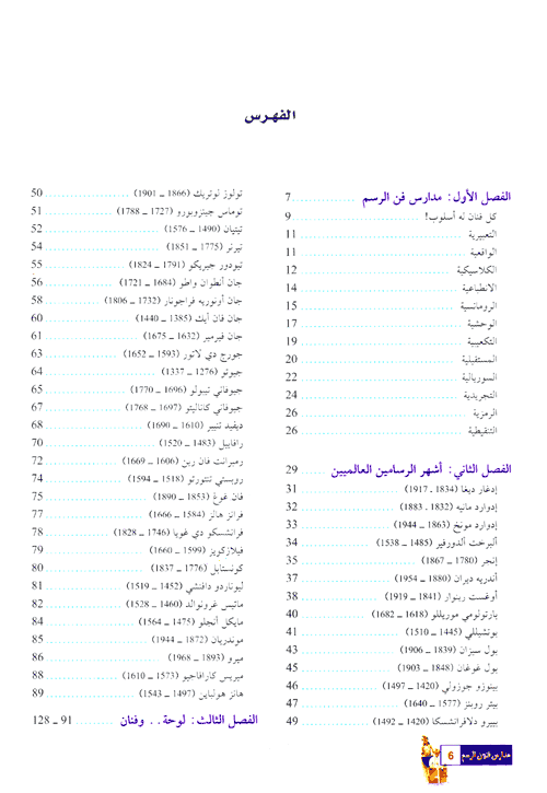كما وسيتم ذكر ترجمة لكافة المدارس الفنية المنتشرة في العالم منها: الواقعية، الكلاسيكية، الوحشية، التعبيرية، التكعيبية، التجريبية، الرمزية... ومن ثم سيتم التحدث عنهم فن الفنانين الرسامين نذكر: جان انطوان واطو، جان فيرمير، رافاييل، روبستي تنتورتو، دافنشي، وغيرهم... إقرأ المزيد