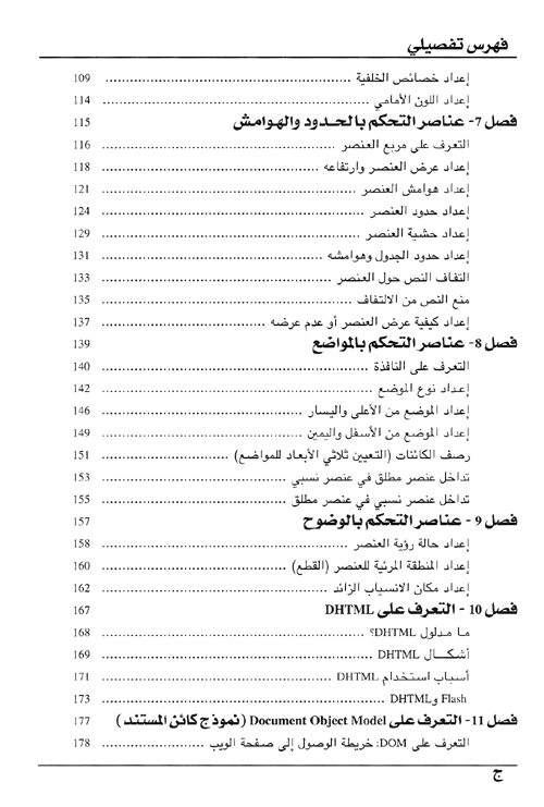 ولتنظيم المعلومات التي يشتمل عليها هذا الكتاب، فقد تم تقسيمه إلى الأجزاء الأربعة التالية: الجزء الأول: يحتوي هذا الجزء على تفاصيل كيفية استخدام للتحكم في شكل محتوى صفحات الويب. وسوف يعرض لك هذا الجزء طرقاً دقيقة للتحكم في الجوانب المختلفة لكيفية عرض صفحات الويب. الجزء الثاني يتناول هذا الجزء كيفية استخدام Document object Model (DoM) Domمع و Jva script لإنشاء وظائف حيوية أساسية. وسيعرض لك هذا الجزء كيفية إنشاء Dom يسمح لك بتشغيل الوظائف الحيوية في معظم برامج الاستعراض باستخدام أقل قدر من الشفرات المتكررة. الجزء الثالث: يركز هذا الجزء على كيفية إنشاء DHTML و CSS باستخدام اثنين من أكثر برامج تحرير صفحات الويب شيوعاً وهما Adobe aolive Dream weaver Macromedia.
