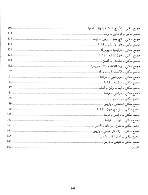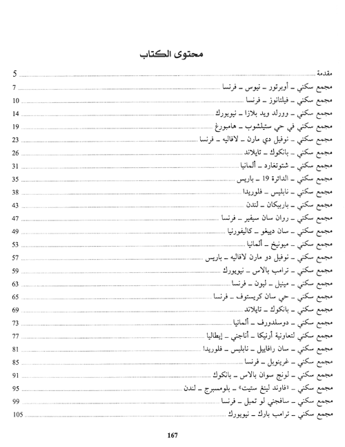 لذا الهدف معرفي وإغناء الفكر الهندسي والإطلاع بالتالي على مادة الاختبار العملانية (المشاريع العمرانية) التي عمل عليها المعماريون الغربيون الإفادة من نتاجهم، وذلك بالغمز، وإظهار مشاريع سكنية متعددة بتعدد معمارييها وتنوع آرائهم واختلاف نظرياتهم، لا يحكمهم محيط واحد ولا اتجاه واحد، لأن العمارة هي نتيجة جهد واختبار في رحاب التاريخ والجغرافيا، فهي ليست مطلقة النجاح، تطورها يرافق الإنسان في عيشه مهما تطورت التقنيات وعلا شأنها، فالأخيرة تعجز عن طمس حقيقة الأفكار المعمارية وجديتها، بل تؤكد عليها لتزيدها غنى في ما يناسبها من التكنولوجيا الحديثة، وذلك لمن وعى استخدامها، لتظهر العمارة حية منسجمة الوظائف مع المحيط الطبيعي لها.نبذة الناشر:يقدم هذا الكتاب أكثر من 48 لمجمع سكني رائد من شتى أنحاء العالم ولكبرى البيوتات المعمارية. وأكثر من 153 منظراً ولقطة لمشاريع سكنية حديثة ومعاصرة هذا إلى جانب 145 شكلاً ومخططاً توضيحياً لمنشآت سكنية تم تنفيذها في مختلف أقطار العالم. إقرأ المزيد