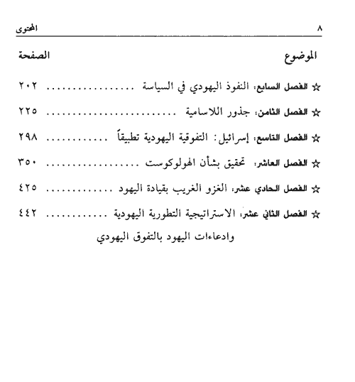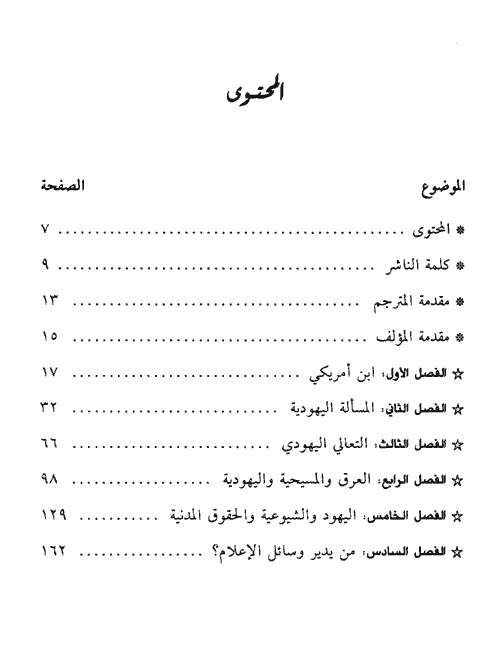 أما فيما يتعلق بالمسألة اليهودية المثيرة للجدل أبداً، فإن ديوك يستخدم عن عمد وبصورة أولية شواهد ووثائق من المصادر اليهودية وهو يشجع القارئ على مراجعتها بعناية لأنها ستذهله. ولدى سرده لـ"صحوته" فيما يتعلق بالعرق، فهو يقدم للقارئ وجهة نظر عالمٍ واقعي طمسته وسائل الإعلام. عسى أن يشكل هذا الكتاب أساساً علمياً وطبيعياً لمن يعيش من الشعب الأميركي خصوصاً والشعوب الغربية عموماً، وعلامة هادية على مسارهم التطوري نحو النجوم.نبذة الناشر:في هذا الكتاب حقائق مذهلة تميط اللثام عن خفايا التأثير اليهودي على السياسة الأميركية، تجاوز فيها المؤلف بجرأة غير مسبوقة، كل المحرمات التي نجحت الصهيونية العالمية في فرضها على العالم عامة وعلى الولايات المتحدة الأميركية خاصة، وذلك ضمن سلسلة من عمليات الإرهاب المنظم لكمّ الأفواه وإسكات الألسنة، حتى لم يعد عضو في الكونغرس يجرؤ على الكلام، ولا باحث جامعي أن يلامس القضايا الحساسة التي فرضت عليها إسرائيل الحظر.. ولم تع تجرؤ قناة إعلامية على عرض مشاهد القتل والاغتيال والتدمير الذي تمارسه في فلسطين.