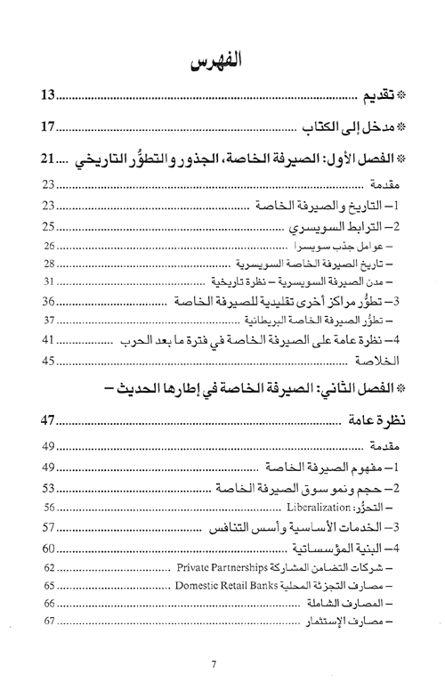 وهو يتألف من اثنى عشر فصلاً، وكل فصل يتضمن عدداً من الأجزاء. يركز الفصل الأول على الصيرفة الخاصة والجذور والتطور التاريخي التابع لها. فهو يقدم لمحة تاريخية عن نشوء البنوك الخاصة كنوع مميز من مؤسسات الوساطة المالية وتطورها في فترة ما بعد الحرب العالمية الثانية. ويتحدث الفصل الثاني عن الصيرفة الخاصة في إطارها الحديث ضمن نظرة عامة. وهو يركز على الاتجاهات الرئيسية واستعراض المكونات الأساسية لصناعة الصيرفة الخاصة خلال التسعينات مع حجم الأسواق العالمية، والخدمات الأساسية المقدمة من البنوك الخاصة على أسس المنافسة الحادة.
