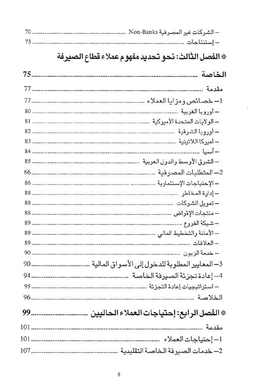 ويتجه الفصل الثالث نحو تحديد مفهوم عملاء قطاع الصيرفة الخاصة، وقاعدة العملاء التي تتكون عادة من الأفراد الأثرياء وعائلاتهم، مع تحديد حجم ثروة هؤلاء الأثرياء، والمزايا الخاصة بهم، ومتطلباتهم المصرفية. كما يتناول المتطلبات المصرفية الخاصة، والمتغيرات المستجدة والتدابير المتخذة في مثل هذه الحالات. أما بالنسبة للفصل الرابع، فهو حول احتياجات العملاء الحاليين لهذه الصيرفة وحاجاتهم للتغيير الدائم ضمن المعطيات المالية العالمية.