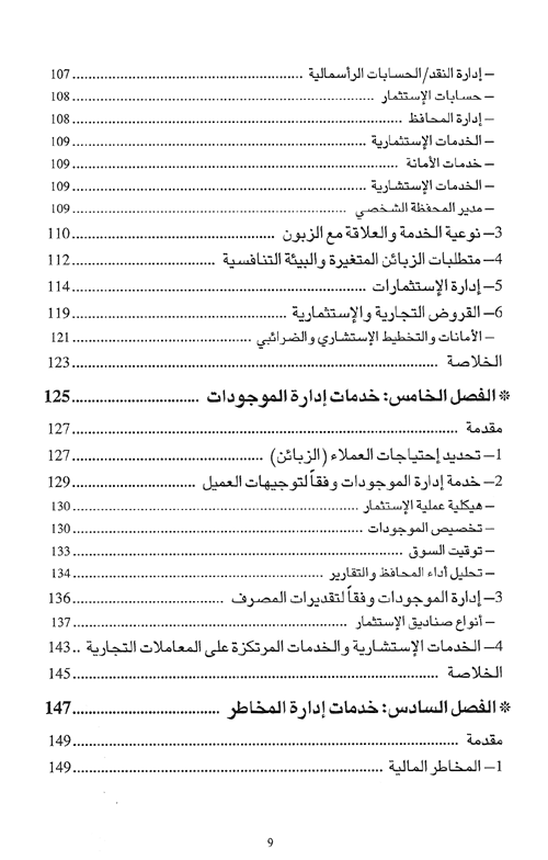 ويستعرض الفصل الخامس خدمات إدارة الموجودات. وهو يبدأ بأنواع المعلومات التي يجب على المصارف الخاصة أن تتوفر لديها. لتحديد احتياجات العمل لإدارة موجوداته، مع التركيز على الخدمات الاستشارية والخدمات المرتكزة على المعاملات التجارية. وفي الفصل السادس ، تم التركيز على خدمات إدارة المخاطر، حيث يلقى الضوء على خدمات إدارة المخاطر ومنتجاتها المقدمة للزبائن من قبل المصرف الخاص، مع شرح مفصّل للمهارات المتنوعة المتوفرة لدى المصرف الخاص الناجح، وسيتعرض هذا الفصل طبيعة المخاطر المالية، ودور التحوط في إدارة المخاطر المالية، مع أمثلة توضيحية على إدارة التحوط من مخاطر الفائدة ومخاطر أسواق السلع والأسهم والقطع الأجنبي.
