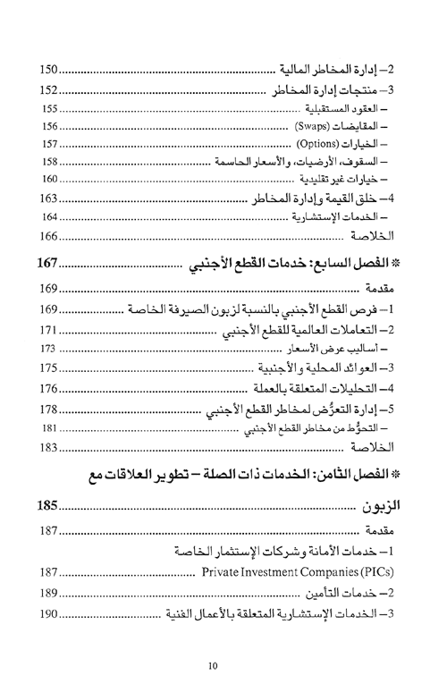 أما بالنسبة للفصل السابع، فهو حول خدمات القطع الأجنبي، التقليدية والحديثة، واحتياجات العميل المصرفي إلى القطع الأجنبي ضمن الأسواق العالمية، وأساليب تقديم الأسعار للعملاء، مع تحليلات واستشارات ونصائح هامة جداً لإدارة المحافظ العالمية، وتحديد الفرق بين العائدات الخارجية والمحلية للتحوط وإعطاء استراتيجيات تغطي تطورات العملة. ويستعرض الفصل الثامن الخدمات وتطوير علاقاتها مع الزبائن بما فيها دور الائتمان، وشركات الاستثمار الخاص، وتنافس الخدمات على التأمين والاستشارات الفنية في شتى المجالات.