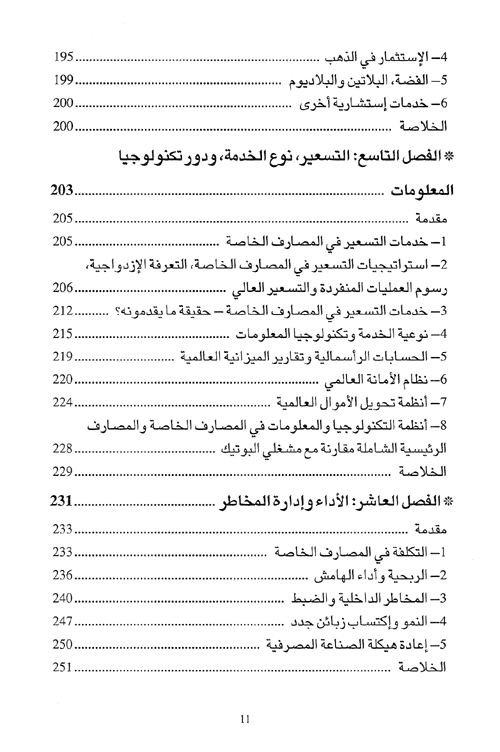 أما الفصل التاسع فهو يتعلق بالتسعير، ونوع الخدمة، ودور تكنولوجيا المعلومات وأهميتها في الميزانية العالمية، ونظام الأمانة العالمي، ونظام تحويل الأموال عير الحدود. وفي الكتاب فصل خاص وهو العاشر المتعلق بأداء وإدارة المخاطر وهو يتعلق بالتكلفة والأداء، ومسائل النمو والمنافسة المشروعة، والدمج، وتعزيز رأس المال، وتسريع عملية هيكلية النظام المصرفي العالمي. ضمن المقررات العالمية المطلوبة حالياً، كلجنة بازل مثلاً.