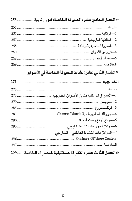 أما بالنسبة للفصل الحادي عشر فهو يتضمن معلومات عن أمور رقابية في المصارف الخاصة ضمنهما بما فيها السرية المصرفية والثقة. كما يبحث بعمق بتبيض الأموال والقيود المالية بما فيها قانون ونظام إدارة الصناديق وكشف الحسابات عند الضرورة. وأخيراً يعنى الفصل الأخير وهو الثاني عشر بنشاط الصيرفة الخاصة في الأسواق الخارجية، مع مقارنة بين الأعمال في الأسواق الداخلية والخارجية في لندن ونيويورك. إقرأ المزيد