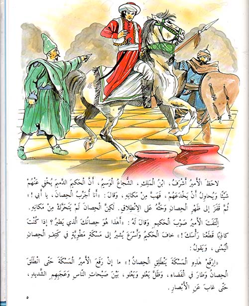 نبذة نيل وفرات:هذه "حكايات محبوبة" رائعة يحبها الأبناء ويتعلقون بها فالصغار منهم يتشوقون إلى سماع والديهم يروونها لهم، والقادرون منهم على القراءة يقبلون عليها بلهفة وشوق، فيتمرسون بالقراءة ويستمتعون بالحكاية، وهم جميعاً يسعدون بالتمتع بالرسوم الملونة البديعة التي تساعد على إثارة الخيال وتكملة الجو القصصي. وقد وجهت عناية قصوى إلى الأداء ...اللّغوي السليم والواضح، وطبعت النصوص بأحرف كبيرة مريحة تساعد الأبناء على القراءة الصحيحة. وهتم كل كتاب بأسئلة تساعد على تنشيط الحصص التعليمية، وتلفت النظر إلى الملامح الأساسية في القصة وتستثير التفكير.نبذة الناشر:إن القوة إذا اقترنت بالشر قد تنقلب حتى على صاحبها. يأتي إلى قصر الملك ثلاثة رجال. يحمل أولهم طاووساً ذهبياً يصيح كل ساعة من ساعات الليل والنهار، ويحمل الثاني بوقاً نحاسياً يحرس بوابة المدينة. ويصطحب الثالث حصاناً عاجياً يزعم أنه يطير. ما قصة هؤلاء الرجال الثلاثة؟ هل ينجح صاحب الحصان في الوصول إلى ما كان يطمع به؟ وهل يستطيع الأمير الشاب أن يكشف سر الحصان، أو يقوى على خوض المغامرات التي يتطلبها ذلك؟ إنها حكاية ساحرة سيقرأها أبناؤنا بشوق شديد. إقرأ المزيد