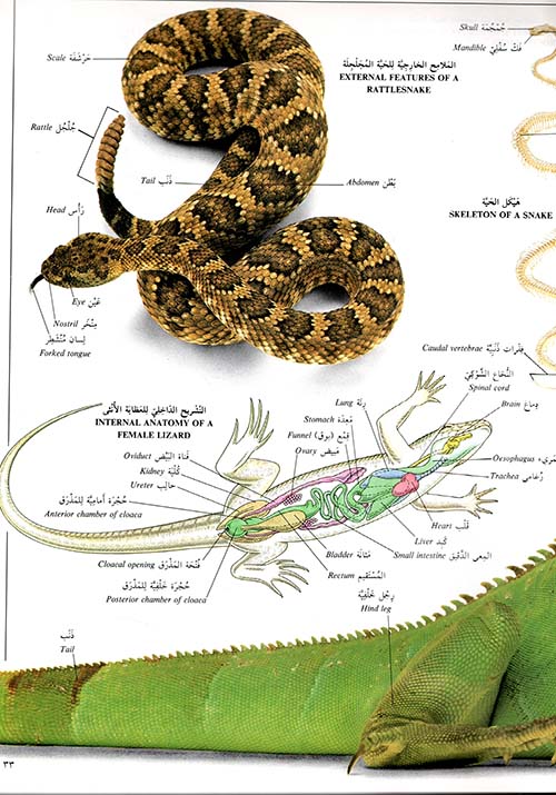 يطالعك في صفحات ...هذا العمل الموسوعي: أكثر من 200 صورة ورسم تمثيلي أخاذة بدقتها وأصالتها وألوانها المتميزة، مناظر مفصلة وصور كاملة وجزئية موضحة تبين دقائق جسم الحيوان وتركيبه التشريحية، طراز من العرض العلمي المشوق يفيد منه الطلاب علماً وتحصيلاً وجميع أفراد الأسرة ثقافة ومعارف، نصوص موجزة جامعة وتعاريف موثقة ميسرة مصوغة بعناية ليسهل استيعابها على مستخدمي الموسوعة من مختلف الأعمار، مسرد من قرابة ألفي مادة يحيلك إلى صفحة المدخل أو الموضوع ويوصلك سريعاً إلى مطلبك، ومصطلحات مثبتة باللغتين العربية والإنجليزية لتعظم فائدة القراء من طلاب المدارس والجامعات وأساتذتها.