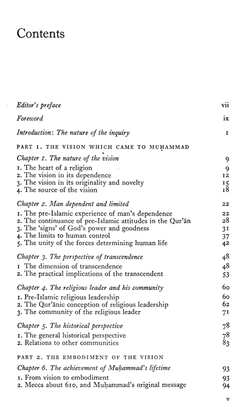 Religion is seen here as a basic plan integrating every aspect and activity of human life which is expressed in a system of ideas or 'vision' of the world that permeates the whole fabric of society and lives of individual believers. It not only embraces theological dogma, forms of worship and political theory, but also lays down a detailed code of conduct including even matters which the Westerner would classify as hygiene or etiquette. This 'vision' is embodied in the teachings of the Quran, which are here examined from historical and theological viewpoints.