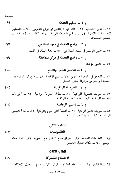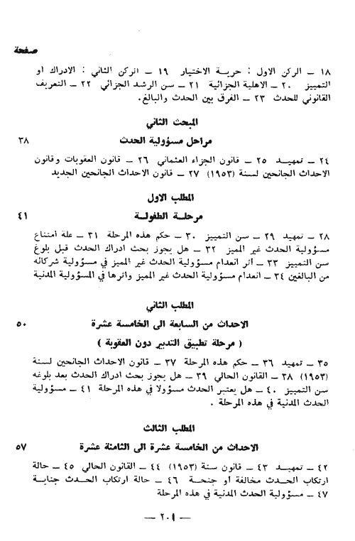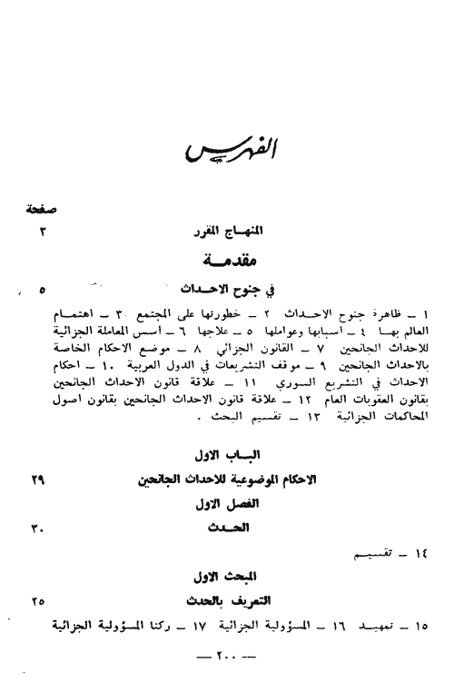 أما الباب الأول فخصص لشرح الأحكام الموضوعية للأحداث الجانحين وبالتالي تم التحدث عن مفهوم الحدث مراحل مسؤولية الحدث، وتعيين سن الحدث، كما وتم التوقف عند التدابير المقررة للأحداث الجانحين. هذا وقد خصص الباب الثاني لموضوع الأحكام الإجرائية للأحداث الجانحين وبالتالي تم التحدث عن قضاء الأحداث والإجراءات الخاصة بالأحداث.