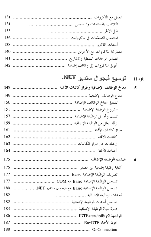 توسيع فيجوال ستديو NET.: هندسة الوظائف الإضافية، معالج الوظائف الإضافية، وطراز كائنات الأتمتة، Add-in Manager Plus، الذي يساعدك على إدارة الوظائف الإضافية وإدخالات السجل الخاصة بها، الأوامر، إدارة الحلول والمشاريع برمجياً، المعالجات، برمجة واجهة مشاريعك، كائنات وأحداث تحرير النصوص، طراز الشيفرة وCod Model Explorer الذي يتيح لك استعراض معاينة طراز الشيفرة الخاصة بمشروعك.