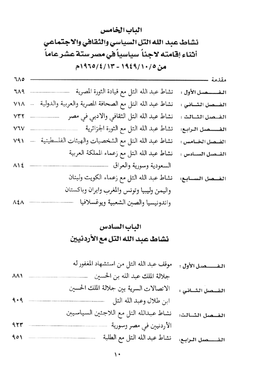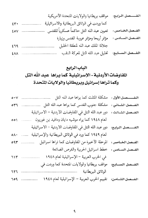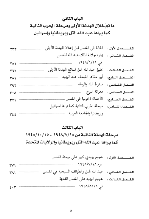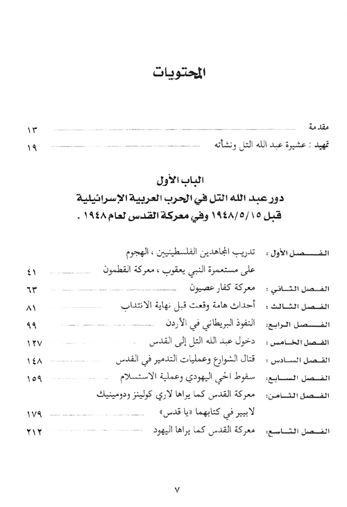 وقد رأى الباحث أن يكون ترتيب مادة البحث على النحو التالي: الباب الأول؛ ويشمل تسعة فصول تتحدث عن دور عبد الله التل في الحرب العربية-الإسرائيلية قبل 15/5/1948 ودوره في معركة القدس عام 1948. ويشمل الباب الثاني ثمانية فصول تتحدث عمّا تمّ خلال الهدنة الأولى ومرحلة الحرب الثانية كما يراها عبد الله التل. ويشمل الباب الثالث سبعة فصول تتحدث عن مرحلة الهدنة الثانية وما بعدها كما يراها عبد الله التل. ويشمل الباب الرابع ثمانية فصول تتحدث عن المفاوضات الأردنية-الإسرائيلية لتوقيع اتفاقية الهدنة كما يراها عبد الله التل وكما تراها إسرائيل. ويشمل الباب الخامس سبعة فصول تتحدث عن نشاط عبد الله السياسي والثقافي والاجتماعي أثناء إقامته لاجئاً سياسياً في مصر ستة عشر عاماً. ويشمل الباب السادس ستة فصول تتحدث عن نشاط عبد الله التل مع الأردنيين، وصدور العفو العام وعودته إلى الأردن وتقييم شخصيته من كافة جوانبها. وينتهي البحث بخاتمة تتضمن أبرز ما ورد في هذا البحث عن عبد الله التل والحرب العربية-الإسرائيلية لعام 1948.