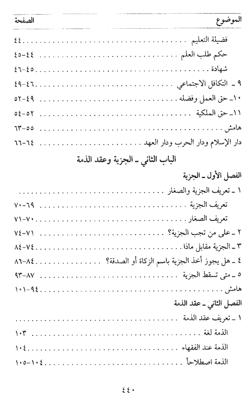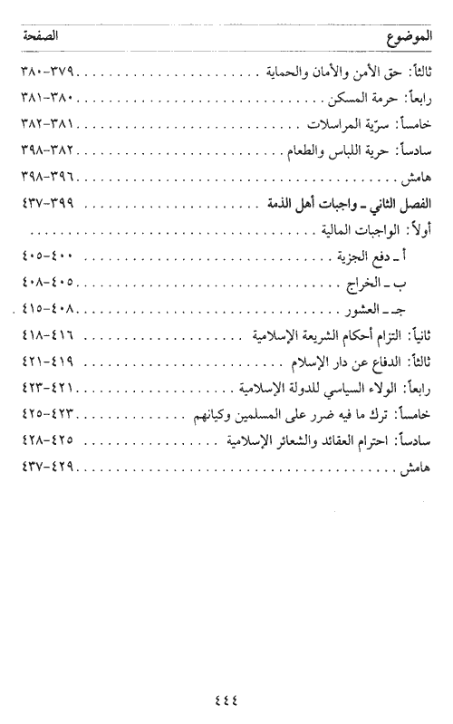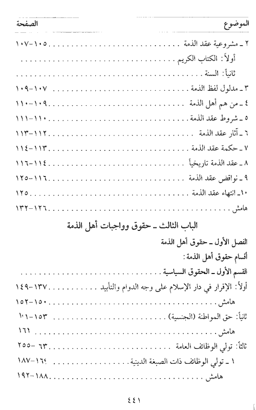 فتحدث أولاً عن أهم الحقوق الإنسانية التي قررها الإسلام، ومن ثم تناول البحث في موضوع الجزية وعقد الذمة، كما وحدد بعد ذلك حقوق أهل الذمة السياسية والمالية والاقتصادية والاجتماعية، الحقوق الشخصية أو الخاصة وأنهى الكتاب بواجبات أهل الذمة والتي هي دفع الجزية، الخراج، العشور، الدفاع عن دار الإسلام ترك ما فيه ضرر على المسلمين وكيانهم احترام العقائد والشعائر الإسلامية، هذه الشمولية في البحث كلفت الباحث عودة جادة شاملة إلى المصادر والمراجع المعتمدة.