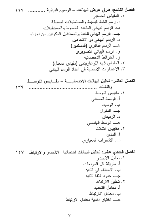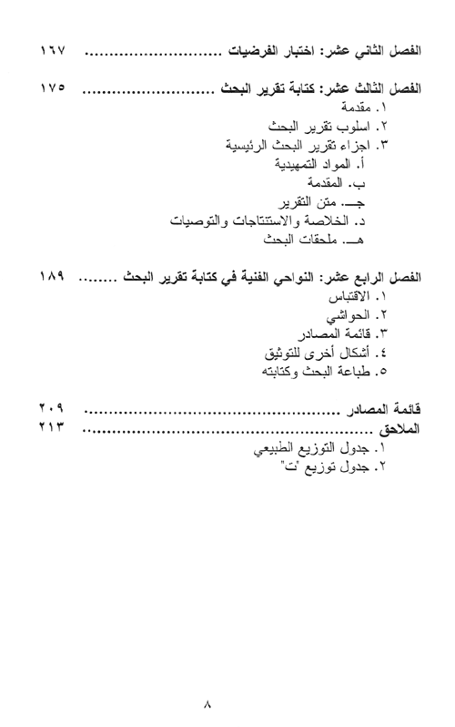 لذلك، فقد تمّ استعراض بحدود ما هو ضروري بعض الأساليب الإحصائية في تحليل البيانات؛ فبعد أن تمّ تبيان كيفية عرض هذه البيانات، سواء أكانت طريقة العرض جداول إحصائية أم رسوم بيانية، قام المؤلف بشرح بعض الأدوات الإحصائية الهامة مثل مقاييس التوسط والتشتت والانحدار والارتباط، وقد وقع ذلك في الفصول المبتدئ بالسابع والمنتهية بالحادي عشر. وفي الفصل الثاني عشر قام بإيضاح كيفية اختبار الفرضيات حيث يتمكن الباحث بعدها إما قبول فرضية بحثه أو رفضها.