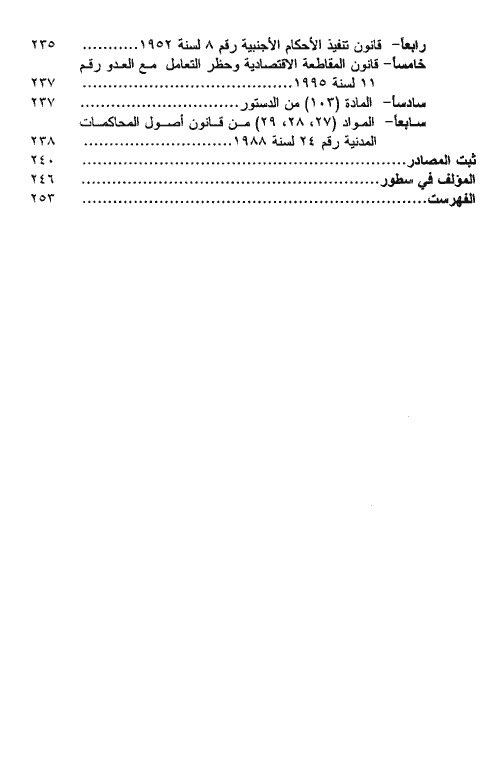 وتناول المؤلف تنازع الاختصاص القضائي الدولي وعلاقته بالقانون الدولي الخاص ومعايير ثبوته،وكذلك الاستثناءات التي ترد على حرية الدولة في تنظيم الاختصاص القضائي الدولي لمحاكمها،كما عالج موضوع تنفيذ الأحكام الأجنبية وقرارات التحكيم عبر فصلين شملا الحكم القضائي الأجنبي وأسباب تنفيذه ،وقرار التحكيم الأجنبي وطبيعته وقوته وشروط تنفيذه.