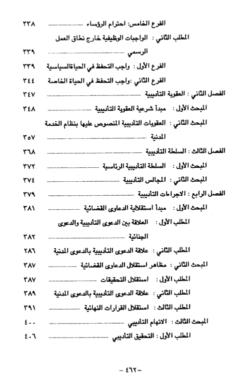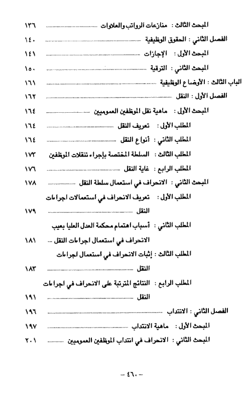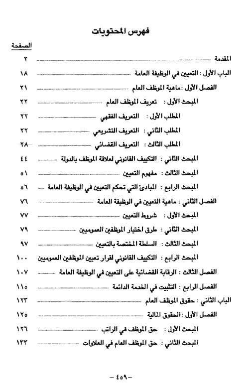 والكتاب الذي بين أيدينا يقع في ستة أبواب: الباب الأول: التعيين في الوظيفة العامة، ويشتمل هذا الباب على تعريف لماهية الموظف العام. والتكييف القانوني لعلاقة الموظف بالدولة وماهية التعيين في الوظيفة العامة والرقابة القضائية على التعيين في الوظيفة العامة. أما الباب الثاني فيدور حول حقوق الموظف العام كالحقوق المالية والحقوق الوظيفية في حين تناول الباب الثالث الأوضاع الوظيفية كالنقل والانتداب والإنابة.