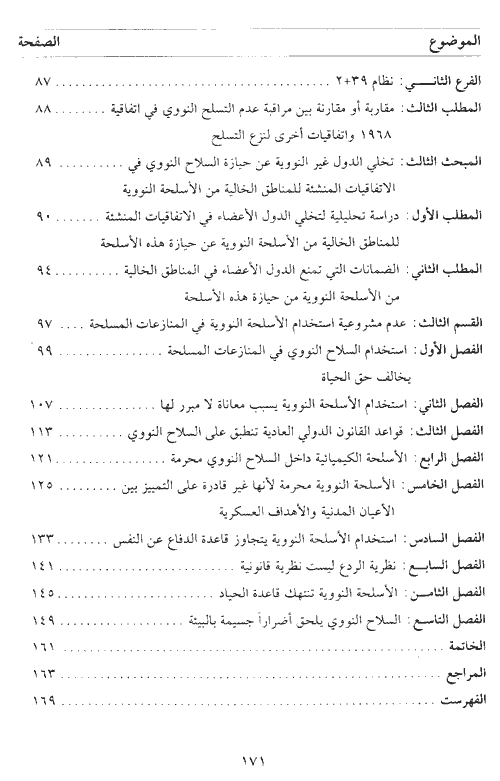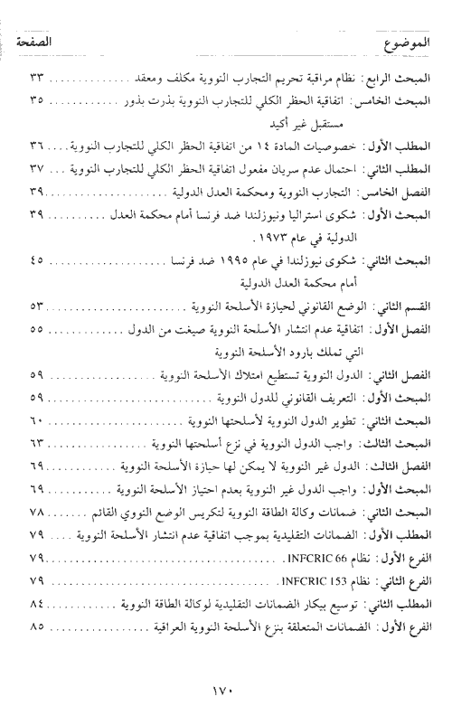وفي هذا الكتاب بحث يتناول الوضع القانوني للأسلحة النووية حيث يبين في فصله الأول بأن اتفاقيات الحدّ من التسلح النووي لم تتعامل مع موضوع التجارب النووية إلا بشكل جزئي، موضحاً في فصله الثاني بأن هذا التعاطي الجزئي لاتفاقيات الحدّ من التسلح النووي لم يمنح الاتفاقيات المنشئة للمناطق الخالية من الأسلحة النووية من تبنّي موقف حازم من موضوع التجارب النووية، كاشفاً في الفصل الثالث على أن تأسيس الاتفاقيات المنشئة للمناطق الخالية من الأسلحة النووية شكّلت بداية لتبرعم حركة دولية غمزت من قناة تحريم التجارب النووية. وأن هذا التبرعم استقام وأدّى في محصلته النهائية إلى إبرام اتفاقية الخطر الكلي للتجارب النووية في أيلول 1996. وهذا ما تم بيانه في الفصل الرابع من هذا الكتاب. أما فصله الخامس فقد تم فيه بيان موقف القضاء الدولي من التجارب النووية. إقرأ المزيد