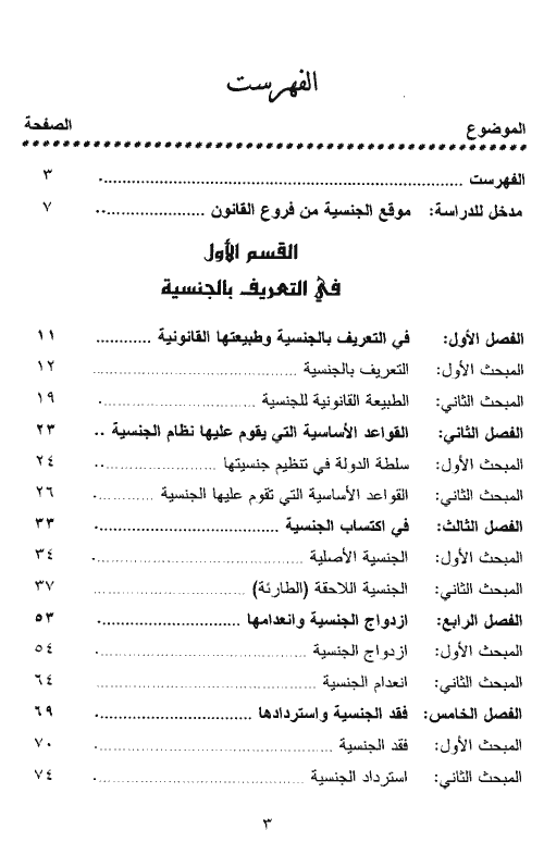 والكتاب يقع في قسمين القسم الأول يتألف من خمسة فصول، يتناول الفصل الأول التعريف بالجنسية وطبيعتها القانونية، أما الفصل الثاني فيعرض للقواعد الأساسية التي يقوم عليها نظام الجنسية، ويبحث الفصل الثالث في كيفية اكتساب الجنسية والفرق بين الجنسية الأصلية والجنسية اللاحقة. بينما يبحث الفصل الرابع في ازدواج الجنسية وانعدامها، ويعرض الفصل الخامس لفقد الجنسية واستردادها.