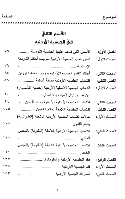 أما القسم الثاني من الكتاب فهو يتألف من خمسة فصول، الفصل الأول، يبحث في الأسس التي قامت عليها الجنسية الأردنية بينما يبحث الفصل الثاني في اكتساب الجنسية الأردنية بصفة أصلية ويبحث الفصل الثالث في اكتساب الجنسية اللاحقة بحكم القانون أما الفصل الرابع فيعرض لفقد الجنسية الأردنية واستردادها. بينما يبحث الفصل الخامس والأخير الاختصاص في منازعات الجنسية وإثباتها وحجية الحكام الصادرة فيها. إقرأ المزيد