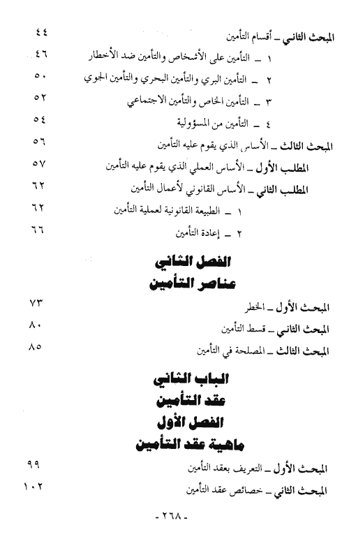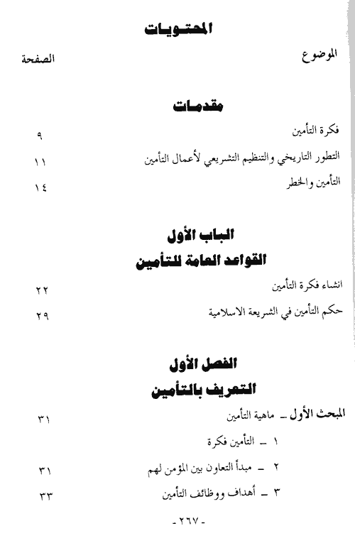 ناقشنا في الباب الأول القواعد العامة، بحيث أوضحنا ماهية التأمين وطبيعته وأهدافه ووظائفه وأقسامه والأساس الفني الذي تنبني عليه فكرة التأمين وكذلك الأساس القانون للعلاقة فيما بين أطراف العملية. وفي هذا الباب تحدثنا في عناصر التأمين وهي الخطر المؤمن ضد كمحل في العلاقة تعاقدية فيما بين المؤمن والمؤمن له والقسط كعنصر رئيسي تقوم عليه العملية التأمينية ثم تحدثنا في العنصر الثالث من عناصر التأمين وهو المصلحة التي تقوم عليها فكرة التأمين.