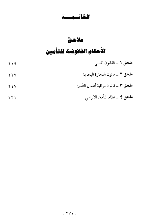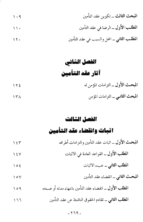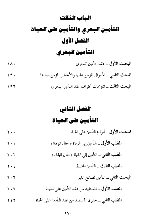 عقود التأمين من الناحية القانونية – النظرية العامة في التأمين – التأمين من المسؤولية – التأمين البحري التأمين على الحياة.