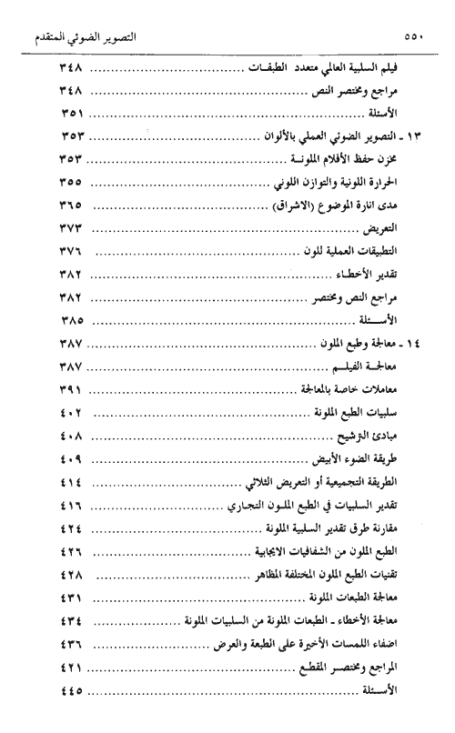 يوجد أسئلة بنهاية كل مقطع، الكثير منها أخذ من أوراق امتحان الكلية الداخلي للسنة الثانية والثالثة والامتحان الوطني الخاص، ورغم أن مراجع أعمال المعالجة تبدو متكررة عملياً فإن كتاب "التصوير الضوئي المتقدم" لا يحوي مقطعاً مكرس خصيصاً لأعمال الأستوديو.نبذة الناشر:هذا الكتاب هو الأكثر شيوعاً وفائدة وهو بالحقيقة العمل النظري في مجاله بالعالم. وتم اختباره وتحسينه خلال عشر طبعات منذ صدوره. وهو العمل النظري الفريد كمرجع. وغايته مساندة أي فرع في علوم التصوير الضوئي والتكنولوجيا والتطبيق لاكتساب المعنى وتبسيط المصطلح المستخدم في حقل مخصص من حقولهم. إنه قاموس يقدم شروحات كافية للأنظمة والأدوات والتقنيات المستعلمة بالتصوير الضوئي في أوسع معاني ممكنة للمصطلح حتى يتمكن المستخدم من فهم القيمة الخاصة للنص. ويتحدث عن: الكاميرا والضوء, التصوير الضوئي بلون وحيد, التصوير الضوئي الملون, من الصور إلى الطبعات. إقرأ المزيد