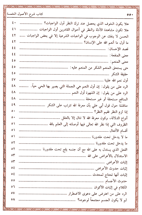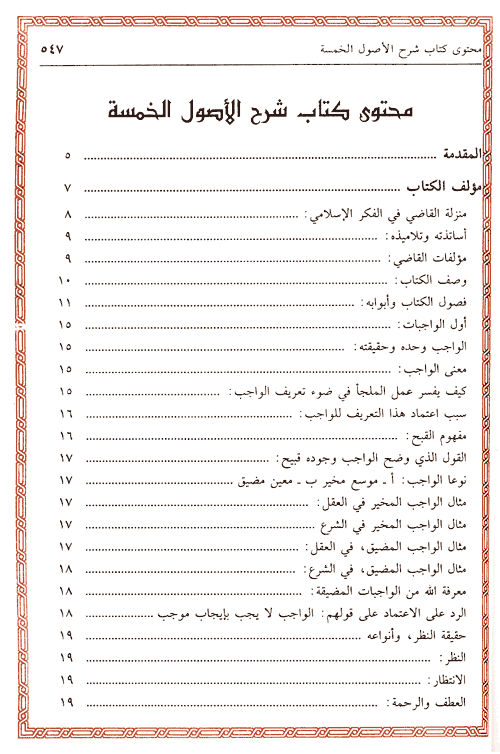 نبذة نيل وفرات:الكتاب الذي نقدمه للقراء هو "شرح الأصول الخمسة": التوحيد، والعدل، والمنزلة بين المنزلتين، والوعد والوعيد، والأمر بالمعروف والنهي عن المنكر. وهي الأصول التي اتفق عليها المعتزلة واختلفوا في غيرها ، وقد أوصل الشهرستاني عدد فرقهم إلى اثنتى عشرة فرقة، يبدأ "شرح الأصول" بمقدمة عن النظر ووجوبه على المكلف، وذلك ...لأن معرفة الله ليس من المعارف الضرورية ولا تكون إلا بالاستدلال ومن هنا كان النظر في الطرق المؤدية إلى معروف الله واجباً.